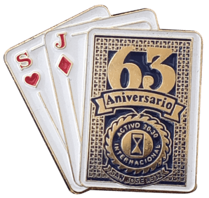 200 pines, dorados, troquelados, 3 colores, tamaño 28 x 26 cm, 1,2 mm de grosor, cierre tipo mariposa, empacados en bolsita plástica individual. Celebración 63 Aniversario